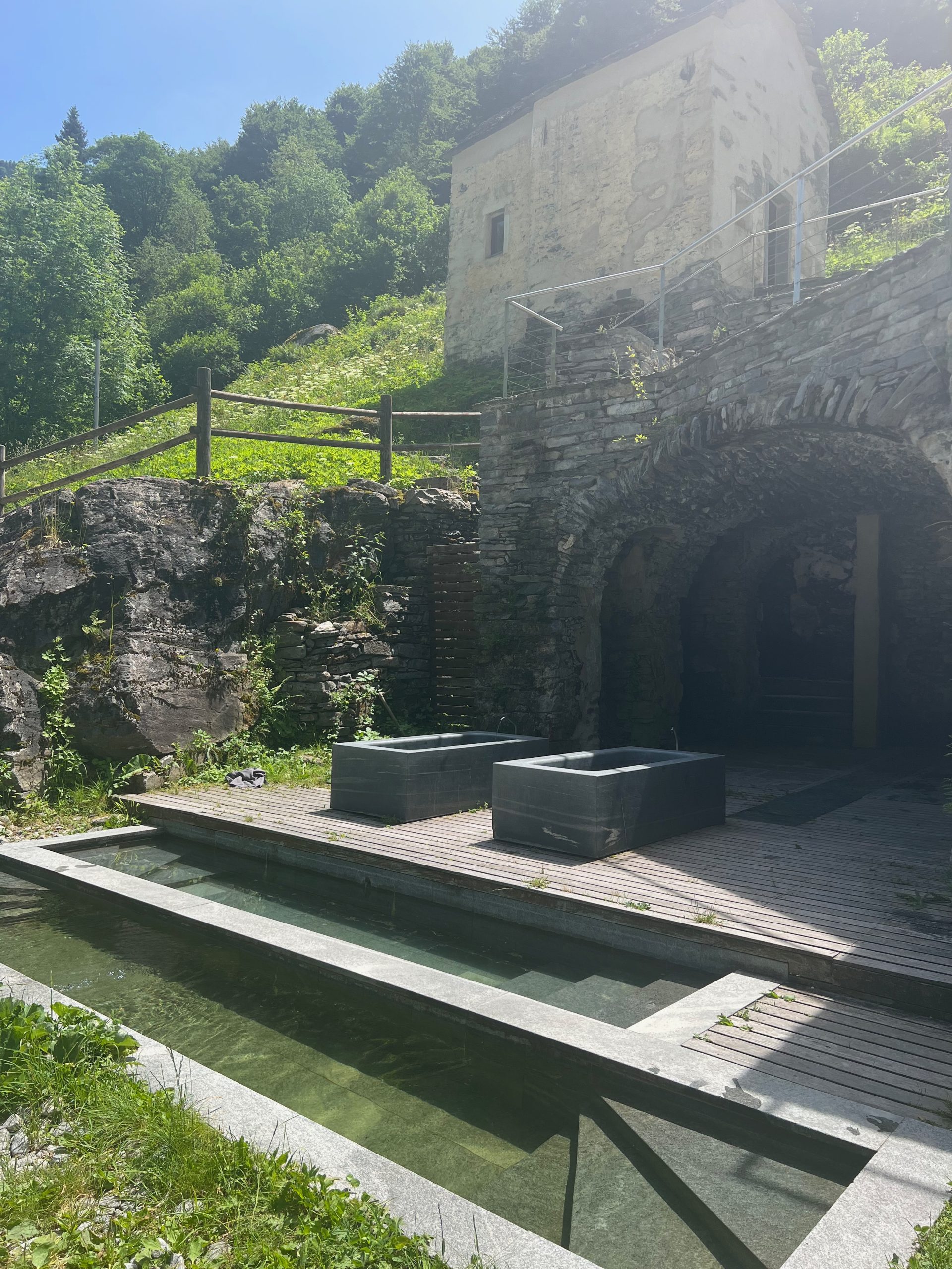 To visit the bathhouse, you’ll arrive in Spruga by car or bus (an absolutely beautiful ride.) Then walk ~40min down a gravel road before wading across the river Isorno into Italy! I came to the baths on a week day, and there were maybe 4-5 other people enjoying them.